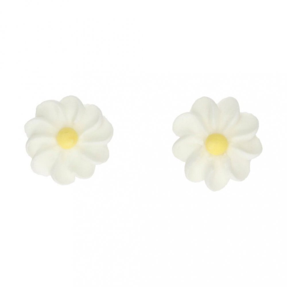 Hvite og gule sukkerblomster som er perfekte til å dekorere kaker, muffins, kjeks og annet bakverk.