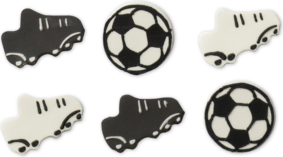 Sukkerdekorasjoner formet som fotballer og fotballsko! Perfekt til fotballfest! Spiselig og flott pynt til kaker, muffins, kjeks eller andre bakverk. Inneholder 2 fotballer og 4 sko, omtrent 3-4 cm store.
