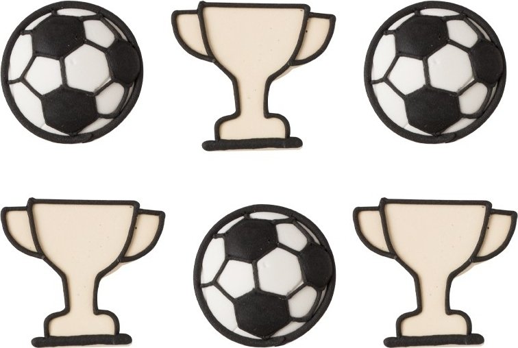 Sukkerdekorasjoner formet som fotballer og trofeer! Perfekt til fotballfest! Spiselig og flott pynt til kaker, muffins, småkaker eller andre bakverk. Inneholder 3 fotballer og 3 trofeer, omtrent 3 cm store.