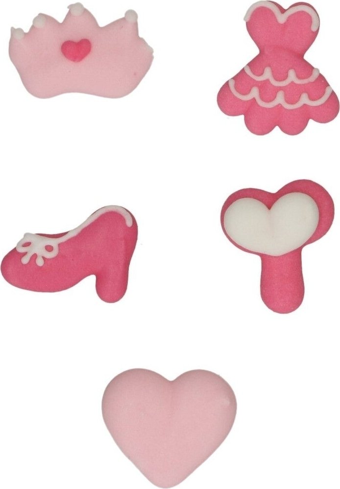 8 søte små sukkerdekorasjoner med prinsessetema: 2 kroner, et speil, et hjerte, 2 sko og 2 kjoler