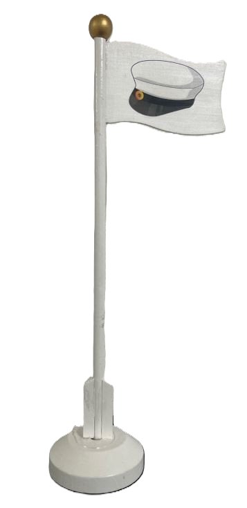 Flagget er laget av tre, og omtrent 30 cm høyt.