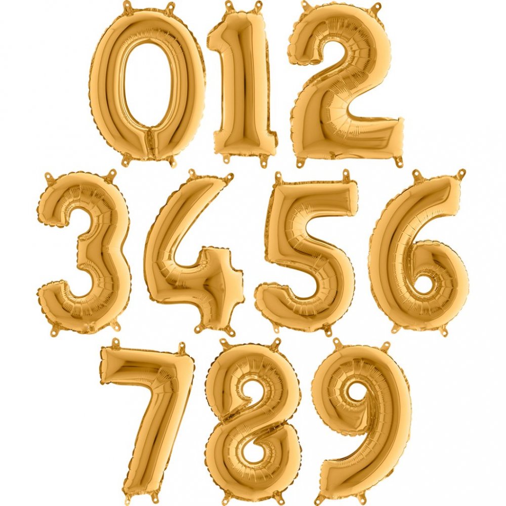 Gullfargede tallballonger i tallene 0-9. Velg tallet ditt i rullegardinlisten ved siden av.Ballongen...