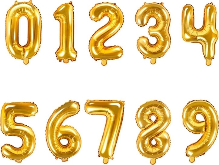 Høykvalitets gullfarget tallballong som kan fylles med både luft og helium. Selges enkeltvis og tilgjengelig i tallene 0-9.