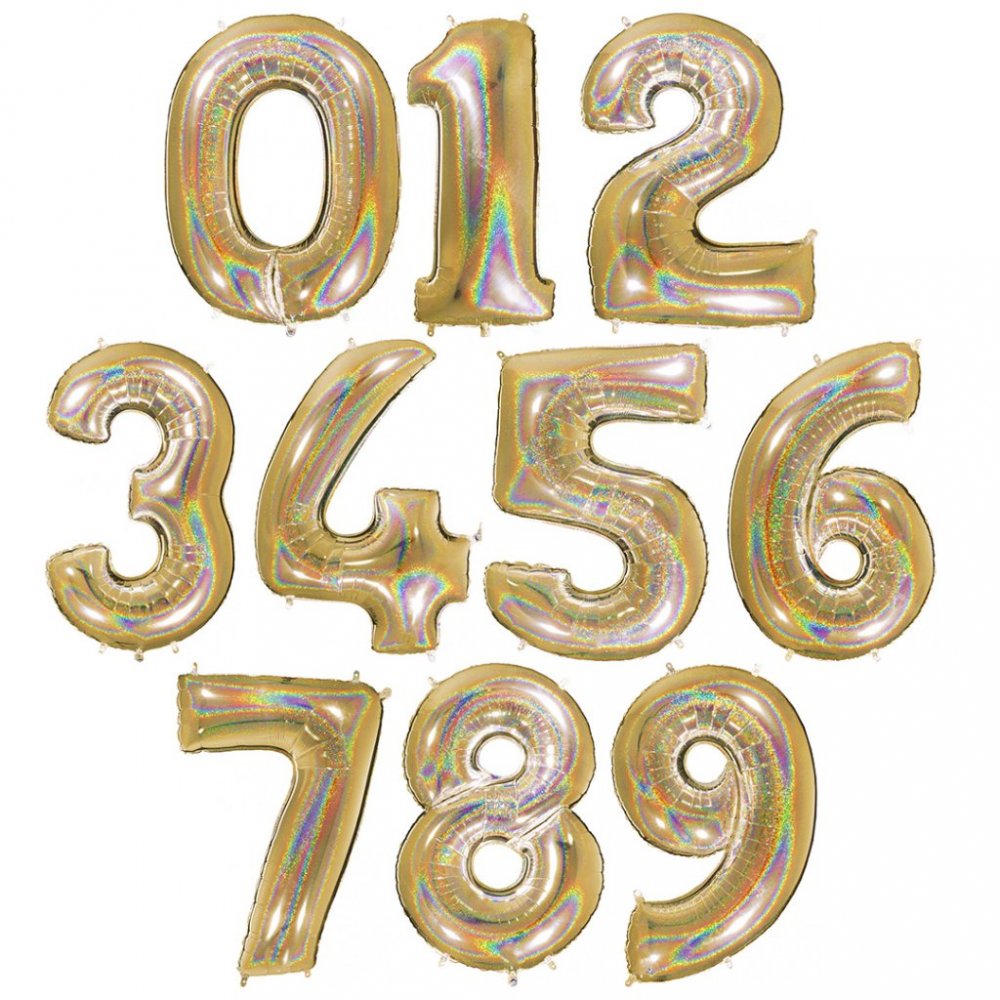 Store ballonger i gullglitter. Tilgjengelig i tallene 0-9.