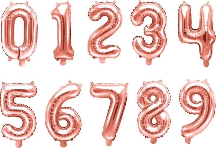 Høykvalitets tallballong i roségull som kan fylles med både luft og helium. Selges enkeltvis og tilgjengelig i tallene 0-9.