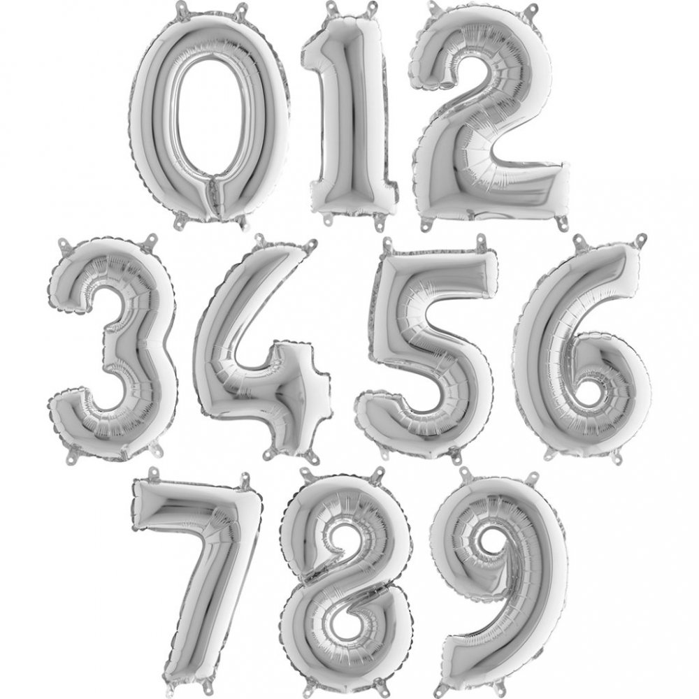Sølvfargede tallballonger i tallene 0-9.