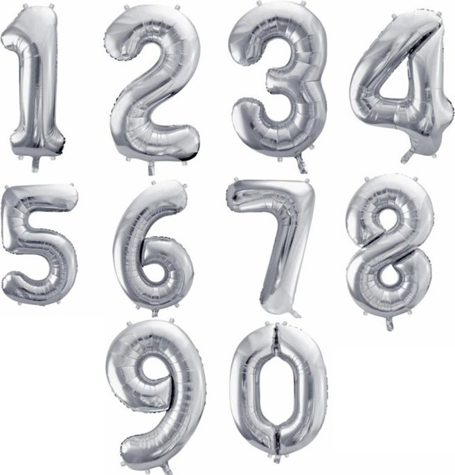 Høykvalitets sølvfarget tallballong som kan fylles med både luft og helium. Ballongen er omtrent 1 meter høy når den er oppblåst. Selges enkeltvis og tilgjengelig i tallene 0-9.