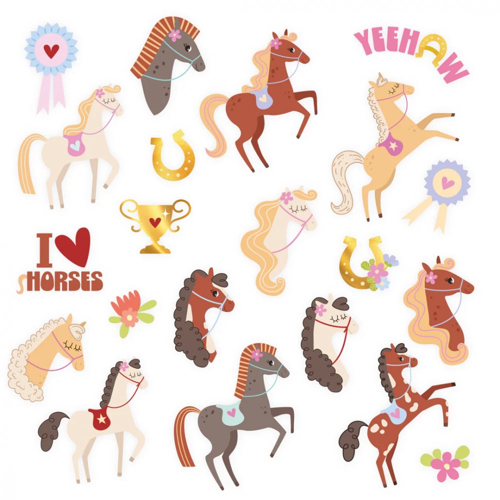 Vakre hestetatoveringer som er perfekte for en temafest eller bursdagsfest! Bruk dem som en hobbystasjon under selve festen, eller klipp dem fra hverandre og plasser dem i fiskedammen!