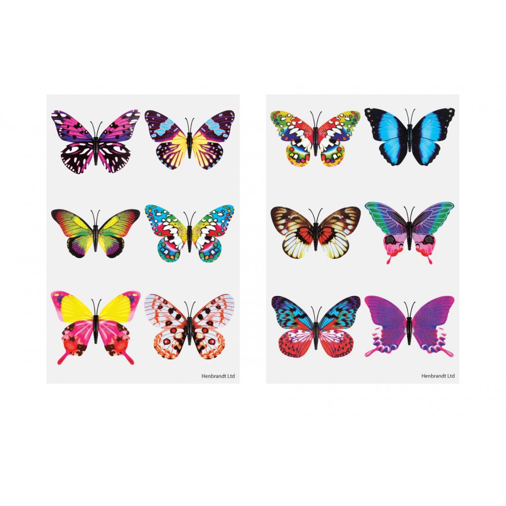 Et kart med 6 midlertidige tatoveringer med vakre sommerfugler, perfekt som en aktivitet på festen eller kanskje til å klippe fra hverandre og legge én i hver fiskedampose?