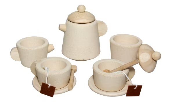 En fin trefarge. Inneholder to kopper med skåler, sukkerskål, melkemugge, tekanne og små teposer.