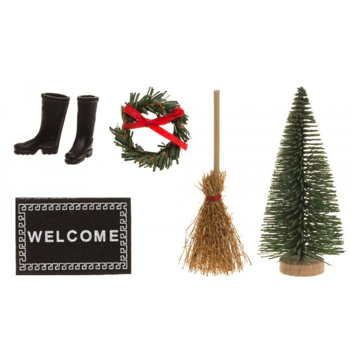 5 forskjellige tilbehør til den lille gnomens lille verden, inkludert dørmatte, kost og små svarte støvler. Det blir ikke søtere enn dette!