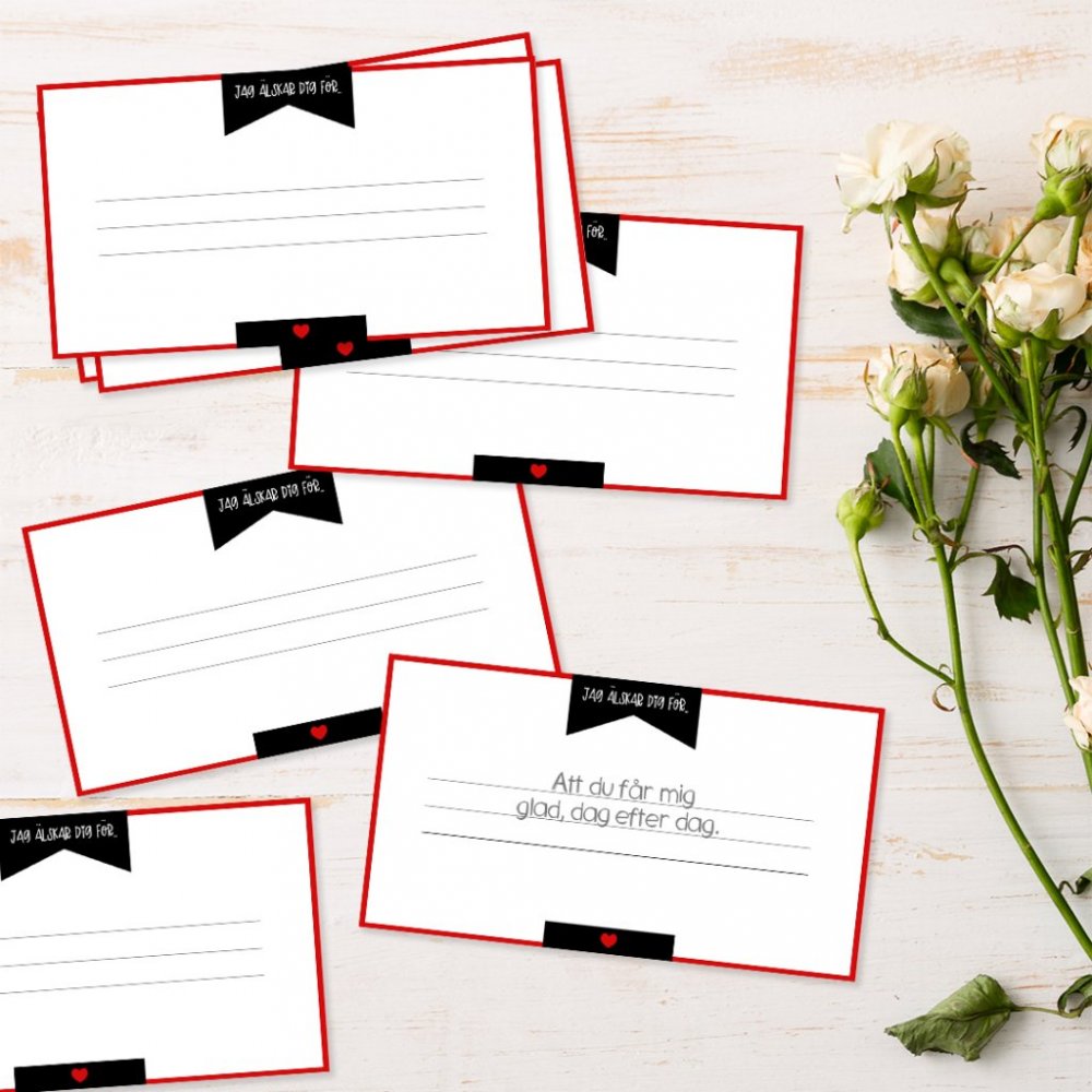20 utfyllingskort med plass til dine egne kjærlige ord. Skriv ordene dine og klipp ut kupongene, legg dem i en glasskrukke eller en fin eske, pakk dem inn i cellofan, og du har en perfekt gave til Valentinsdagen.