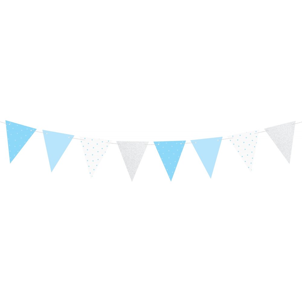Vimpel i blått og sølv med blandede mønstre - superfin dekorasjon å henge opp på fester, dåp og babyshower!