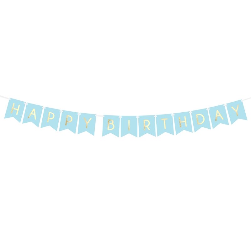 Nydelig vimpel i lyseblått, med gullfoliert tekst Gratulerer med dagen. Så fint til bursdagsfest.