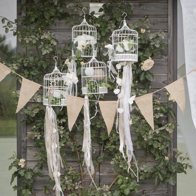 Vimpel i jutestoff. Omtrent 3 meter lang. Hver vimpel er omtrent 26 x 15 cm.