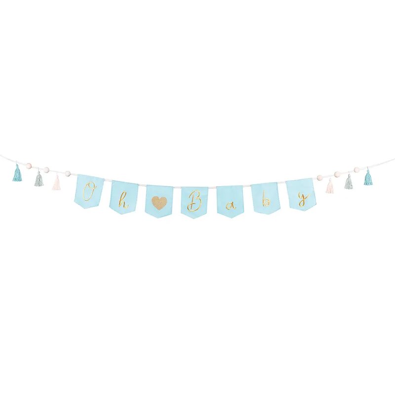 Superfin vimpel i lyseblått og gull med teksten «Oh Baby». Dekorative dusker som gir det lille ekstra.